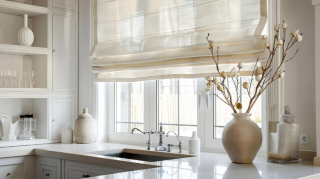 Amennyiben konyhánk egybenyílik a nappalival, igyekezzünk olyan megoldást választani, mely színében, stílusában összhangban van a nappali textiljeivel. Egy sűrűn virágos nappali dekor függöny mellé nem feltétlenül passzol egy konyhai sávroló.